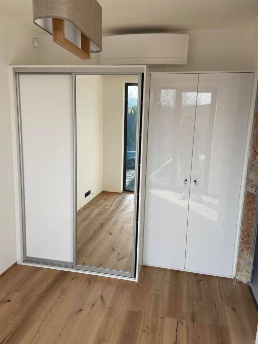 Vestavěná skříň využije výšku místnosti až ke stropu, zachytí každý výklenek a obejde i šikminy. Na stejném půdorysu tak uloží víc než volně stojící nábytek. Přidejte posuvné dveře a získáte volnější průchod v úzkých chodbách i malých ložnicích.